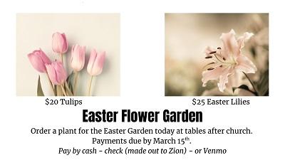 $25 Easter lilies or $20 Tulips. Fill out the online form or paper form. Bring cash or checks, payable to Zion, to the front office or pay via Venmo.